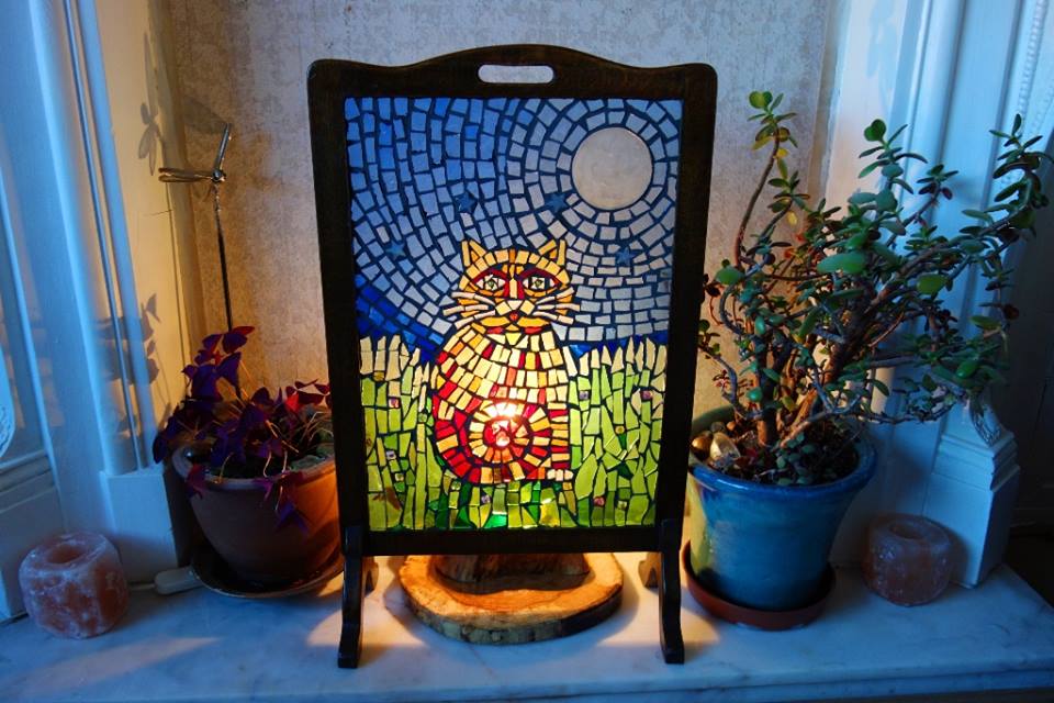 An example of an antique fireguard tapestry that I refurbished and made into a stained glass mosaic.