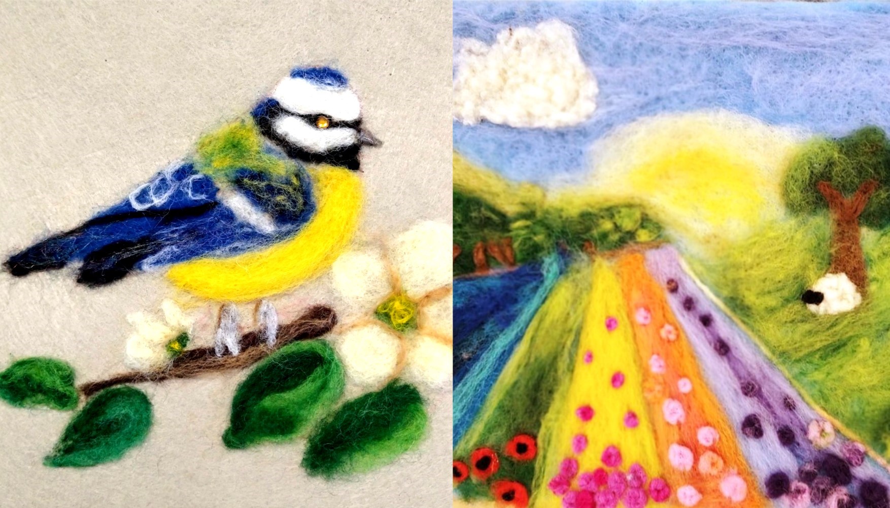 Explore richly textured fabric through the medium of merino wool, trims and embellishments! We will use felting needles to create a design, then add fine detail with a sewing needle. Choose a base to create abstract, landscape or fantasy. Your masterpiece can be framed or added to a cushion or book cover.