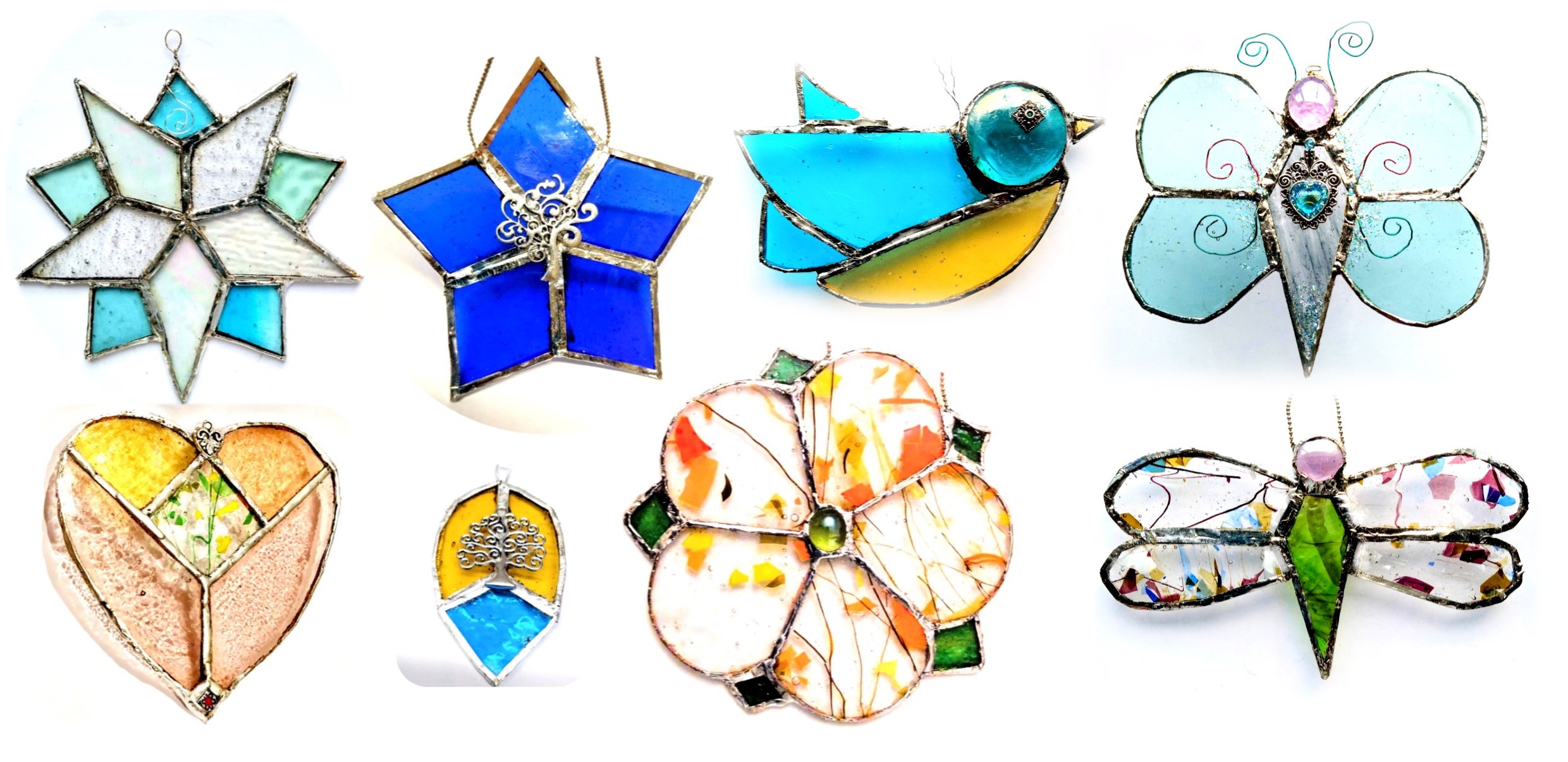 Enjoy some creative time on this beginner-friendly session. Learn the art of copper foil in a more traditional stained glass style.We will learn about Copper Foiled Glass which allows us to work with easier designs. You can choose the skill level that you feel comfortable with. You will start with a smaller practice piece, then choose your main design from what you learned. You can find student examples in the student gallery.