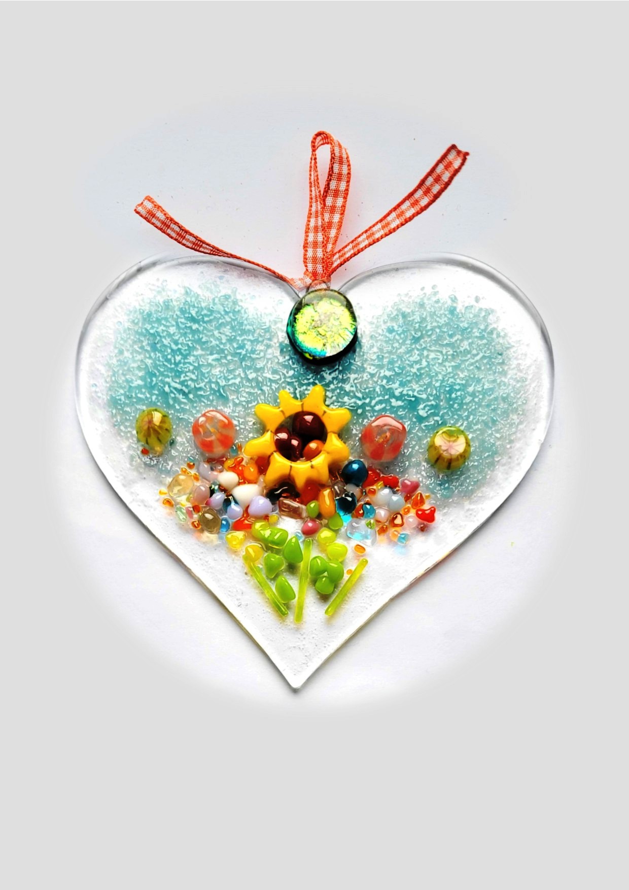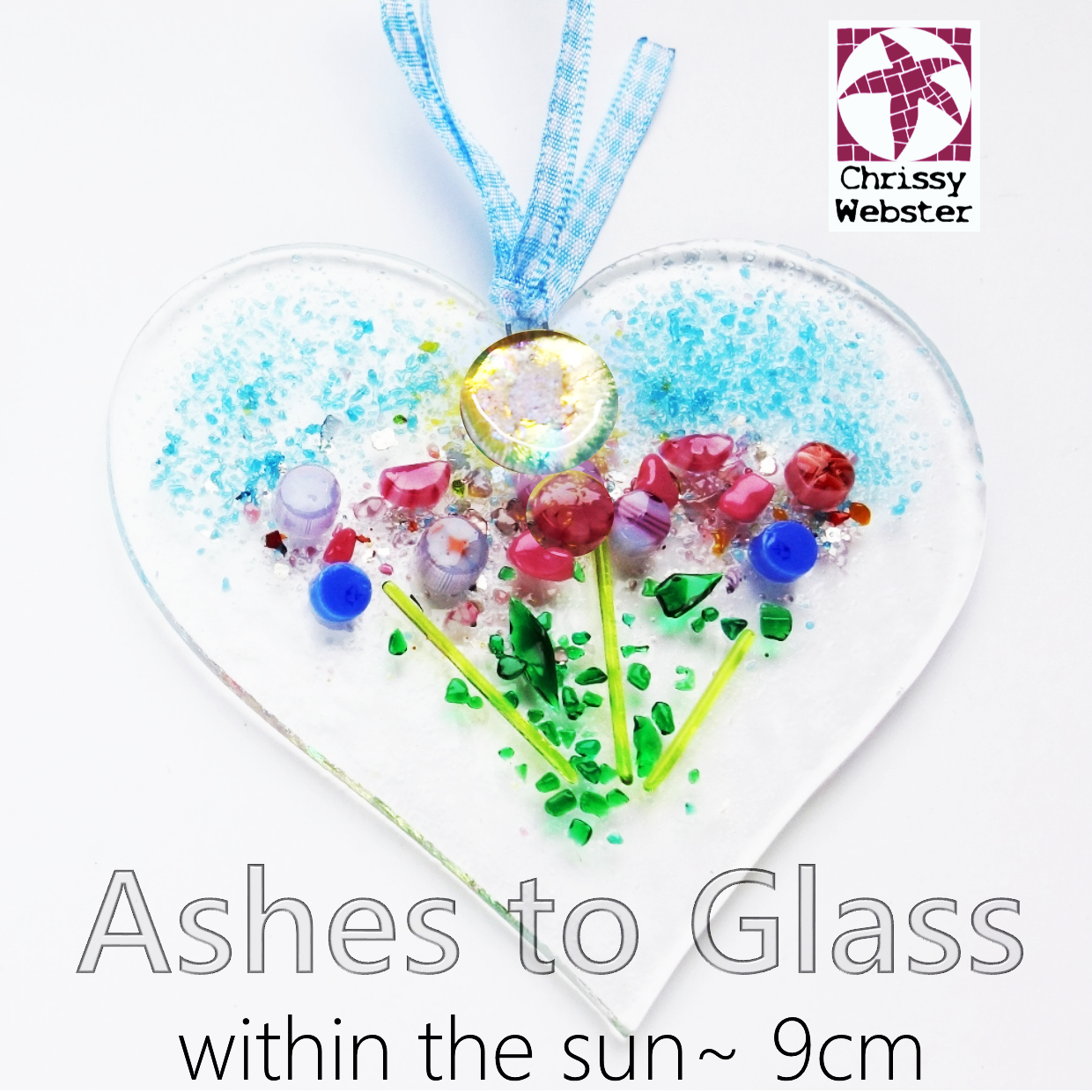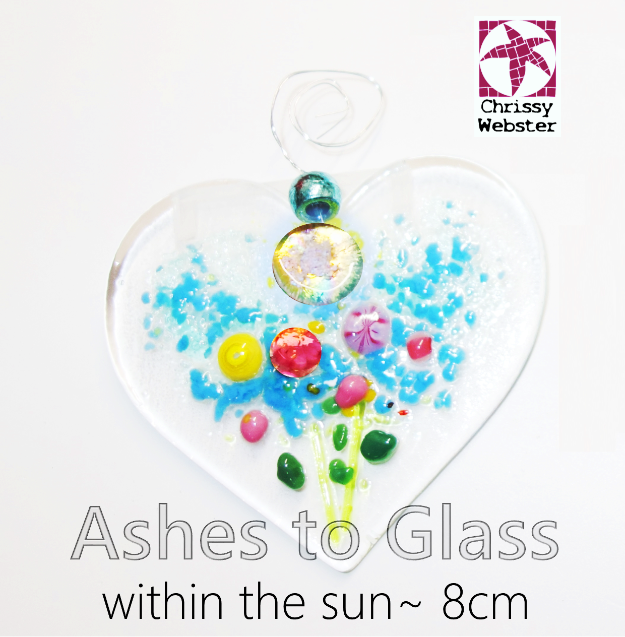Remember a pet or loved one, shining close to your heart. Fused glass in relief form onto a 3mm base with ashes featured within the sun. The pendant comes with a silver plated snake chain. Please note that this is not suited for those with severe nickel allergies.(approx 53mm tall). Also avail. as keyring or window hanging