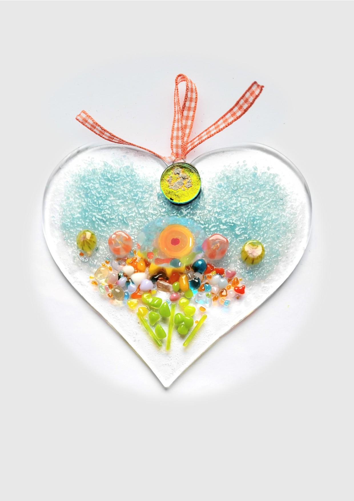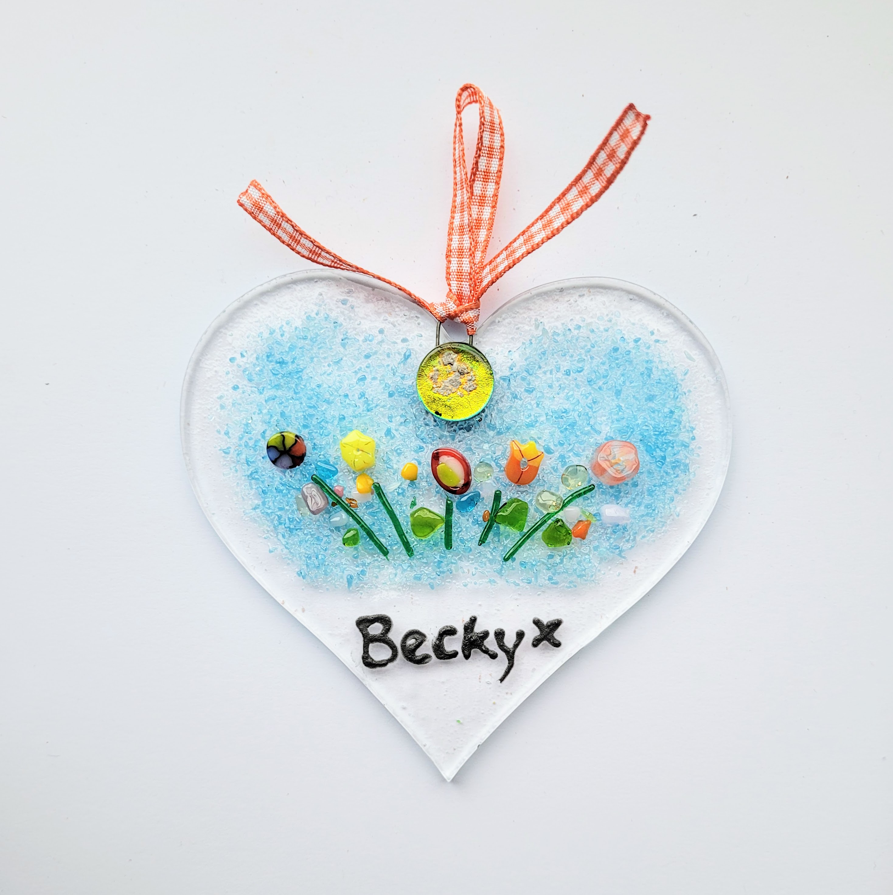 These glass pendants are a great way to remember a pet or loved one, shining bright in a window. The pet treasures are little copper shapes set inside the 6mm melted glass with a bubble effect rainbow bridge (choose shapes of a cat, dog, fish, horse, bird or rabbit)