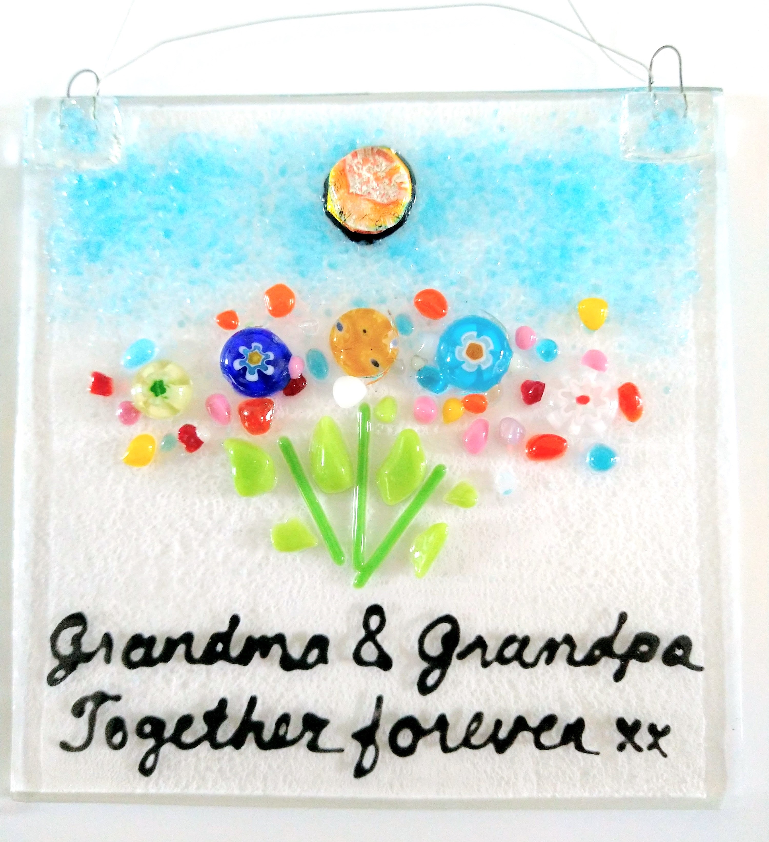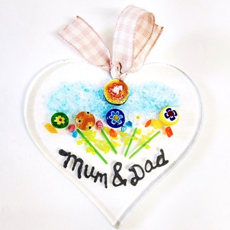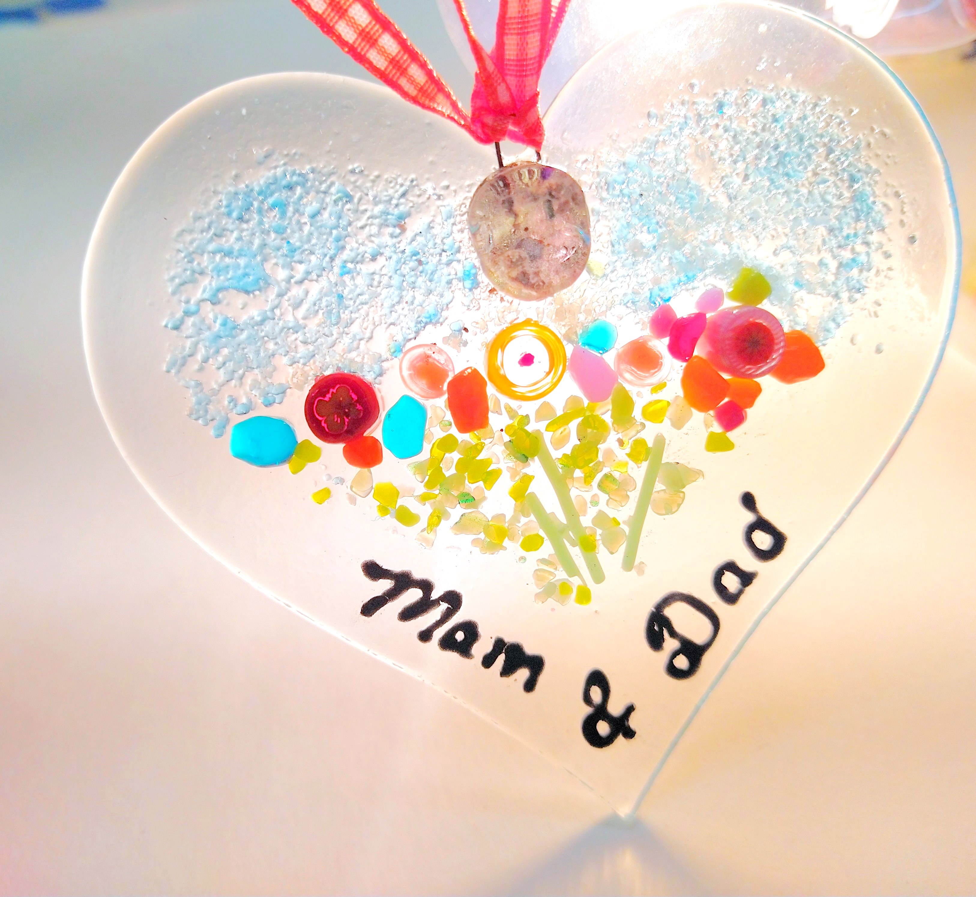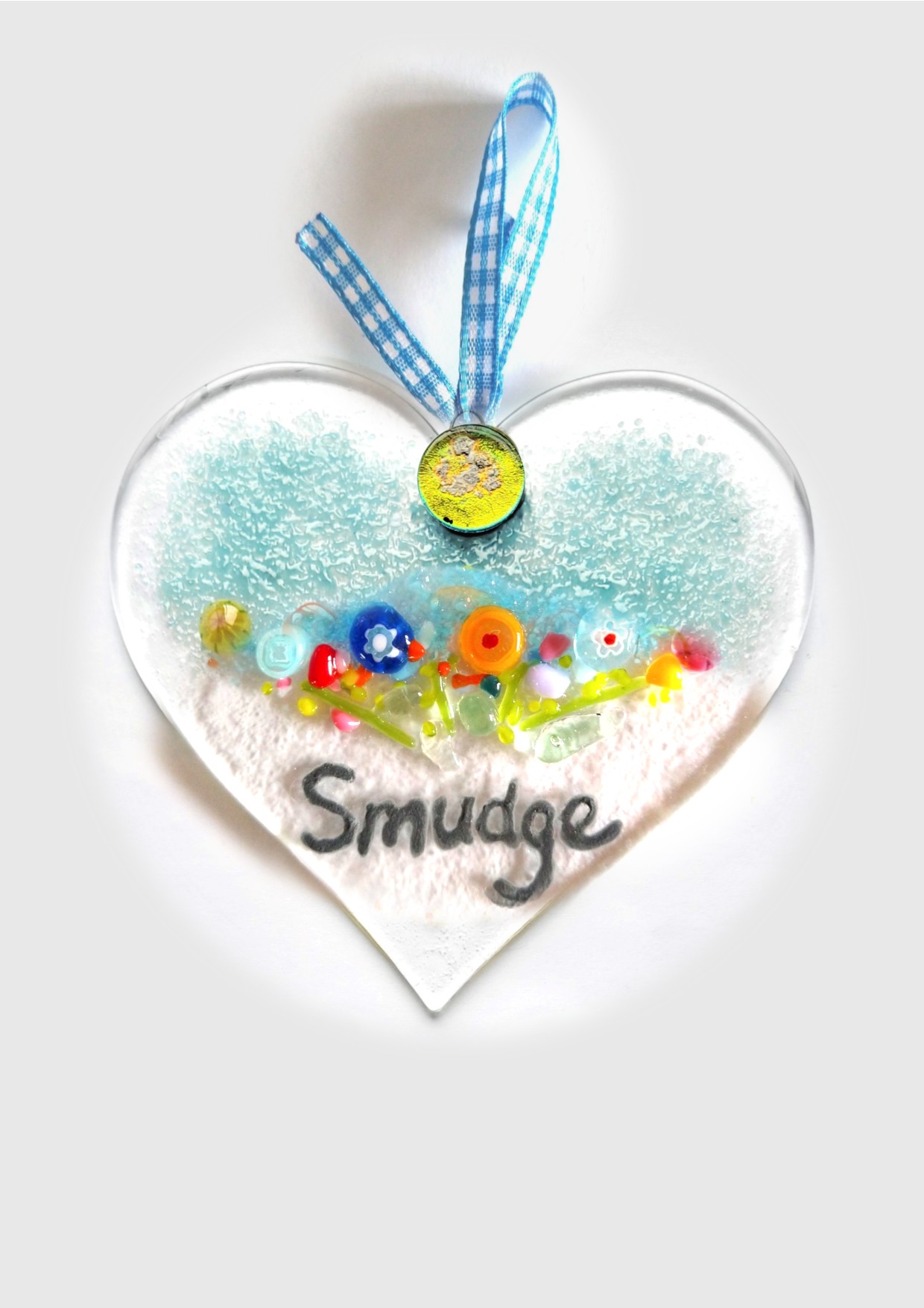 Add your own design or choose metal shapes of cats, dogs, fish, horse, birds and rabbits. This example is an enamelled illustration for a mother and father, but the pet treasures are available as little copper shapes set inside the melted glass with a rainbow bridge.