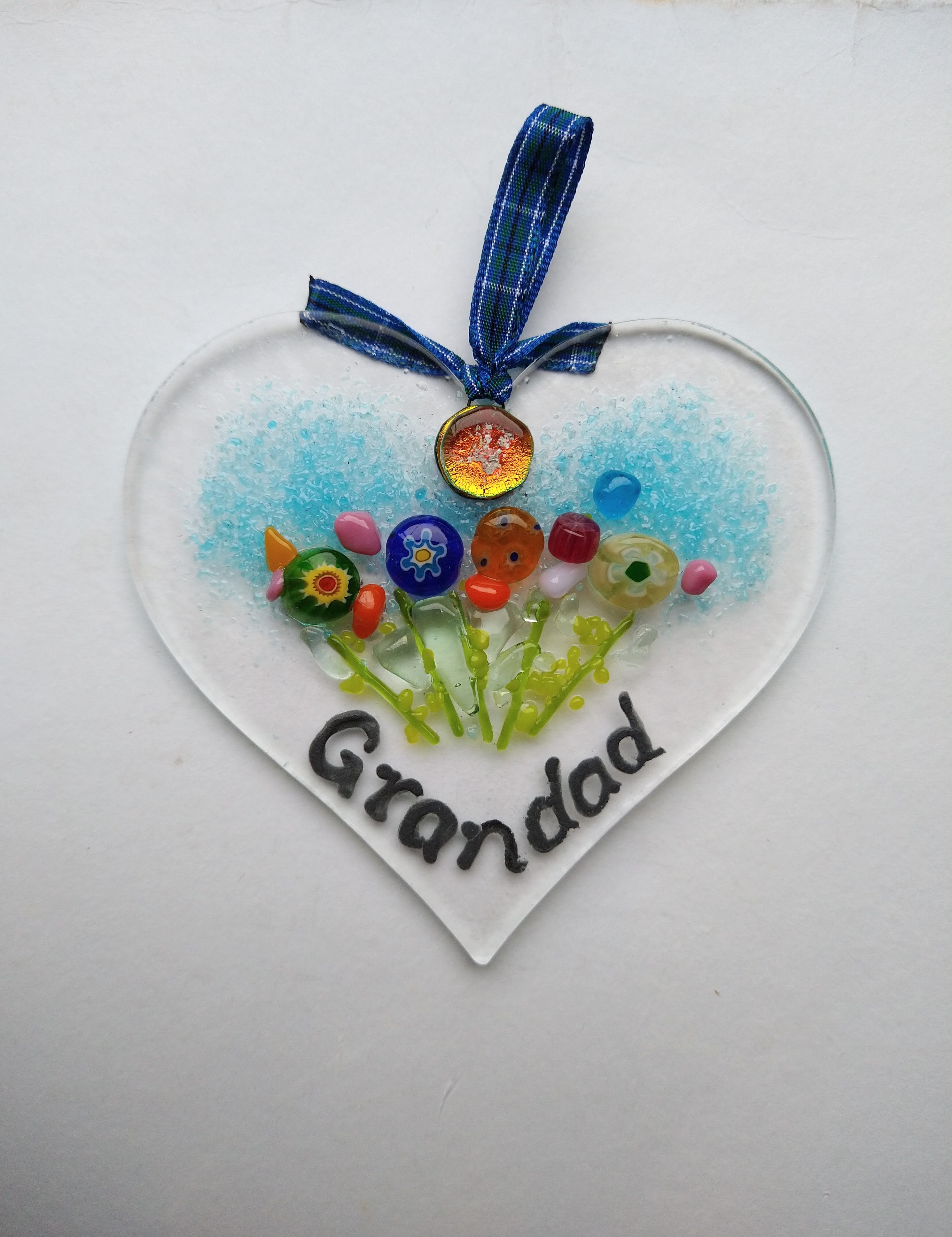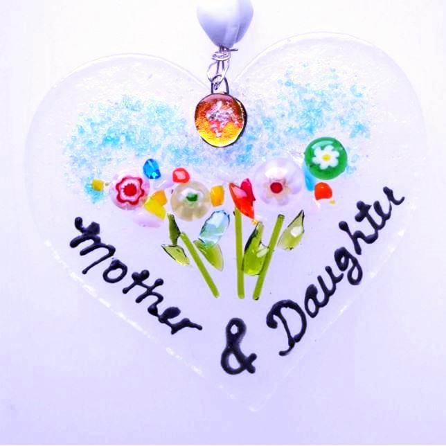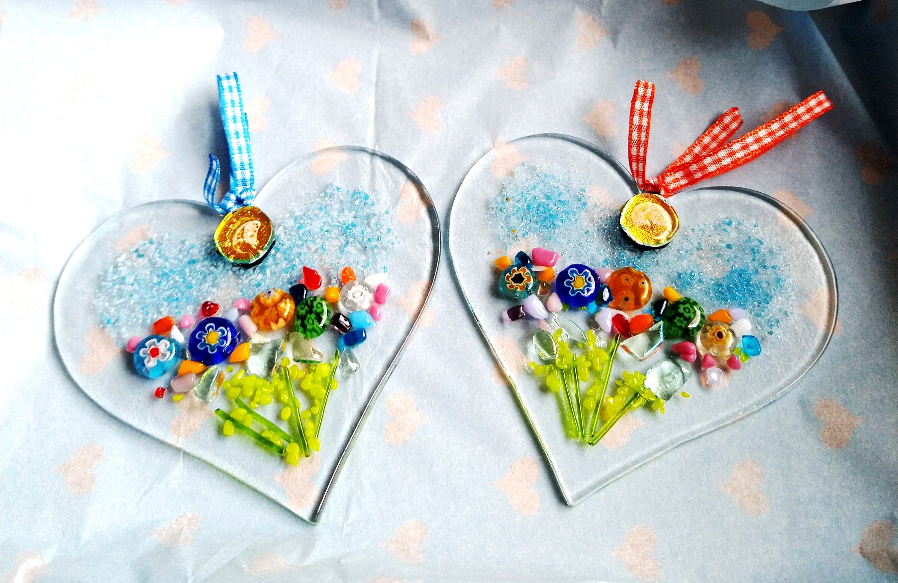Add your own design or choose metal shapes of cats, dogs, fish, horse, birds and rabbits. This example is an enamelled illustration for a mother and father, but the pet treasures are available as little copper shapes set inside the melted glass with a rainbow bridge.