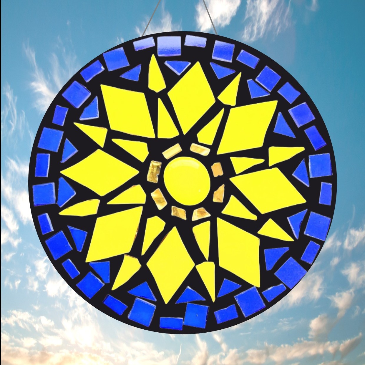 Brighten any window with this colourful, sunflower design with an indigo blue stained glass background